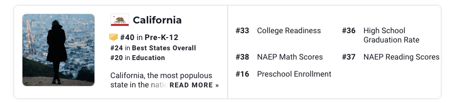 US News and World Report publishes an annual ranking of graduate programs in education. In 2023, #3, #9, #10, #21, #32, #41, #52, #71, #76, #89, and #100 are spots held by California schools.